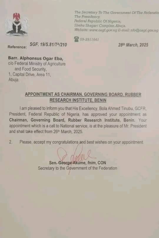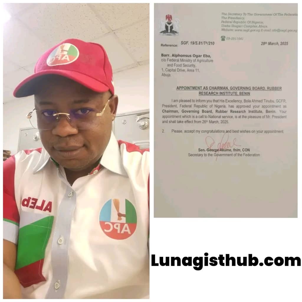 President Tinubu has appointed Barr. Alphonsus Ogar Eba, the APC Chairman for Cross River State, as the Chair of the Governing Board of the Rubber Research Institute in Benin. This appointment comes as the APC National Executive Committee (NEC) includes him in a seven-member Constitution Review Committee (CRC).
