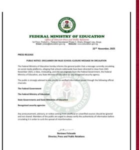 In a statement released on Saturday, November 22, the ministry clarified that it did not issue any circular or directive ordering the closure of schools across the country. The ministry’s spokesperson, Folasade Boriowo, urged the public to rely solely on verified information from official channels, cautioning against the spread of misinformation.
