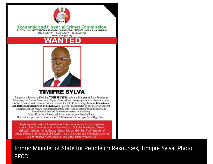 The EFCC alleges that Sylva, who also served as the former Governor of Bayelsa State, diverted the funds meant for the construction of a refinery. A Federal High Court in Lagos granted a warrant for his arrest on November 6, 2025, after the EFCC approached the court with evidence of the alleged fraud.