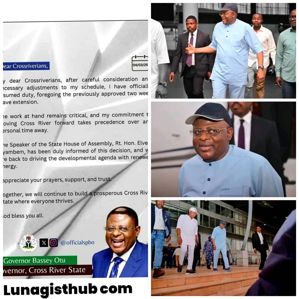 Governor Bassey Edet Otu of Cross River State has officially resumed his duties following a three-week vacation that began on March 11, 2025. His first task upon returning is to chair the gubernatorial primary election for the All Progressives Congress in Anambra State. The Governor arrived in Awka, the capital of Anambra State, on the evening of Friday, April 4, 2025, in preparation for the primary election scheduled for tomorrow Saturday, April 5. He also announced the cancellation of a two-week leave extension that had been approved by the State House of Assembly.