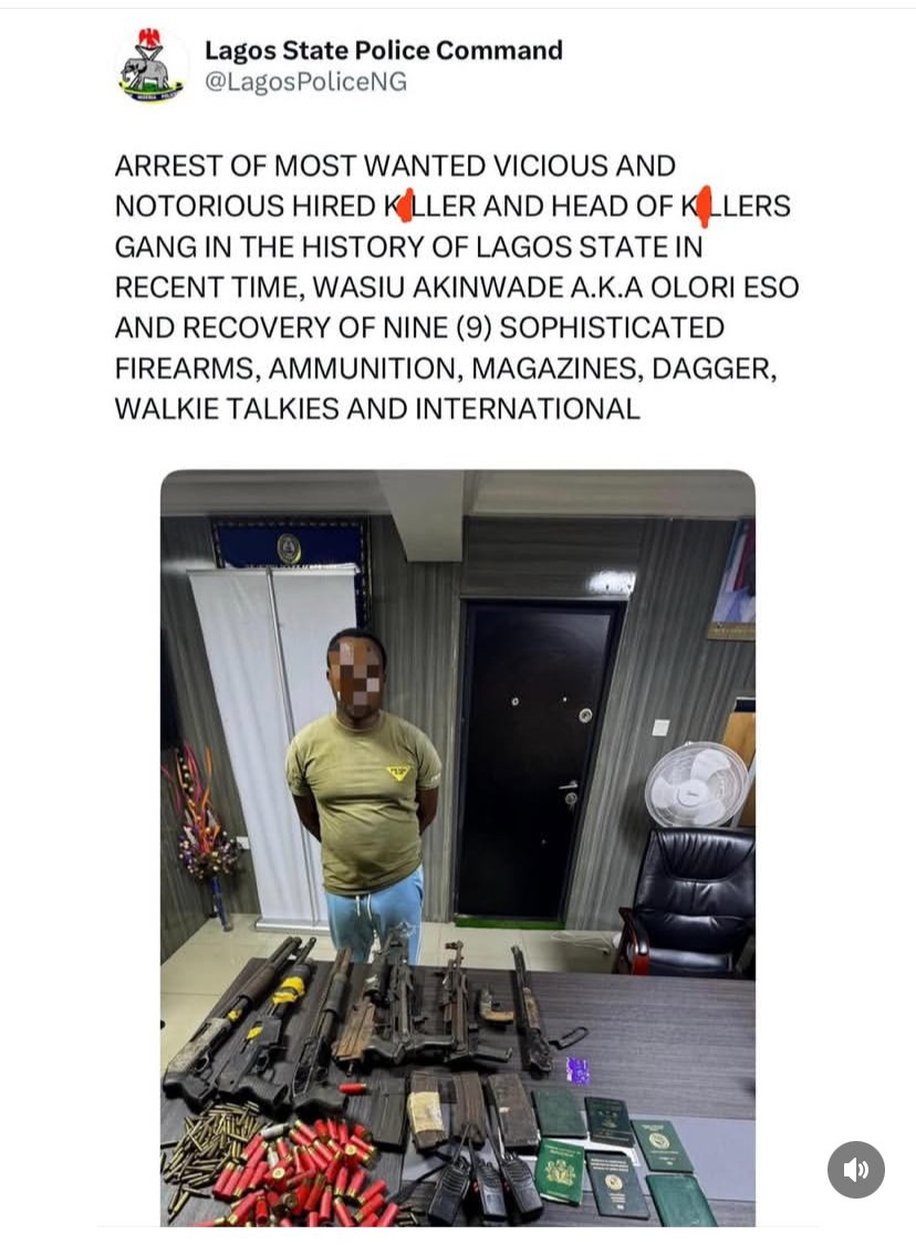 The Lagos State Police Command has announced the arrest of Wasiu Akinwande, alias “Olori Eso”, a 44-year-old suspected hired killer and cult kingpin. The notorious gang leader was apprehended on June 20, 2025, during a special operation code-named Silence, Speed, and Surprise.