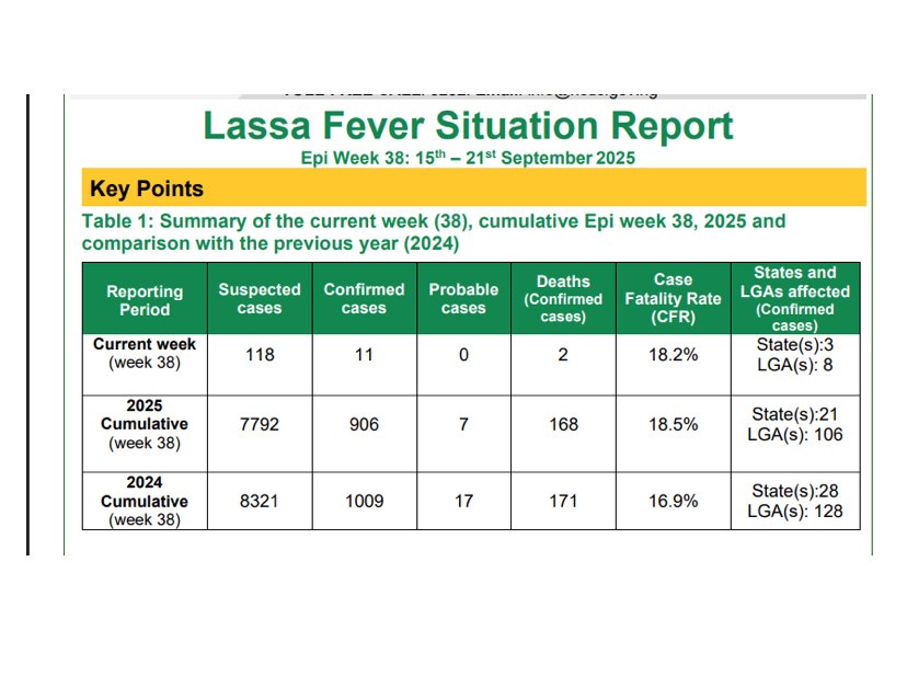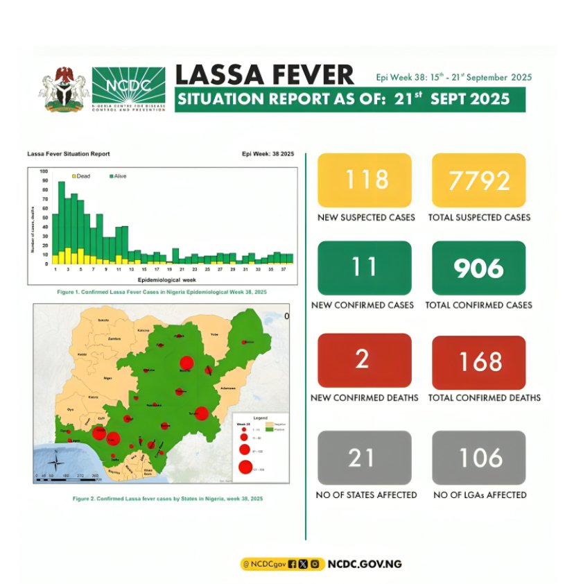 The Nigeria Centre for Disease Control and Prevention (NCDC) has reported a significant outbreak of Lassa fever across 21 states in Nigeria, resulting in 168 deaths. The states most affected are Ondo, Edo, Taraba, and Bauchi, accounting for 67% of all confirmed cases.
