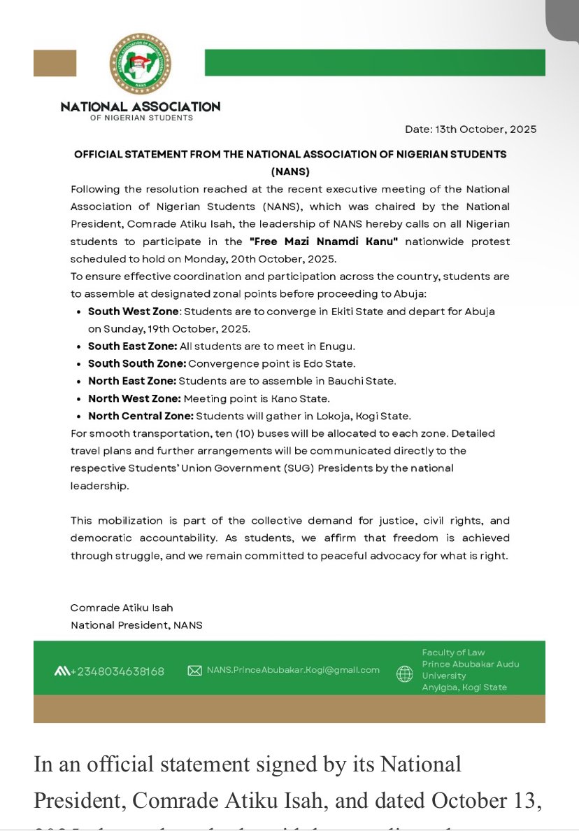 The National Association of Nigerian Students (NANS) has announced a nationwide protest scheduled for October 20, 2025, to demand the release of Mazi Nnamdi Kanu, the detained leader of the Indigenous People of Biafra (IPOB). In a statement signed by NANS President, Comrade Atiku Isah, the students’ body called on all Nigerian students to participate in the protest, themed “Free Mazi Nnamdi Kanu”.