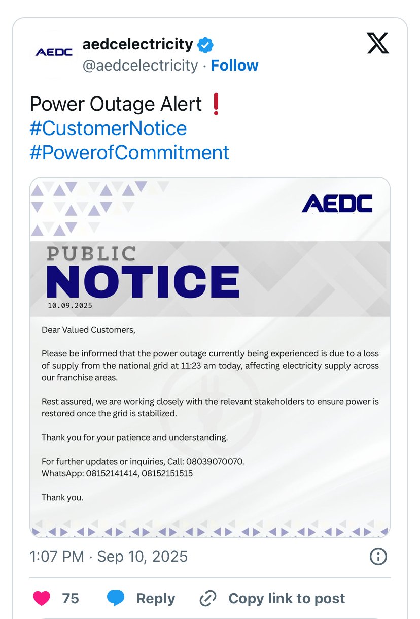 A nationwide power outage hit Nigeria on Wednesday, September 10, 2025, after the national grid collapsed, causing widespread disruptions to electricity supply. The outage occurred around 11 am and 12 pm, with a significant drop in megawatts generated.