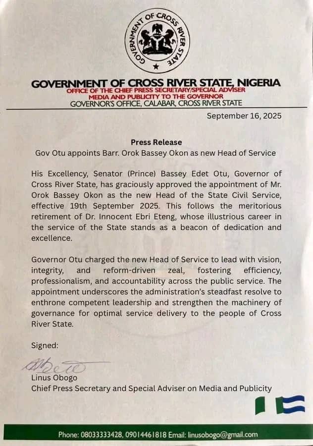 The appointment of Mr. Orok Bassey Otu comes after the retirement of the former Head of Service, marking a new chapter in the state’s civil service. With his new role, Mr. Otu is poised to play a crucial part in shaping the state’s administrative framework .