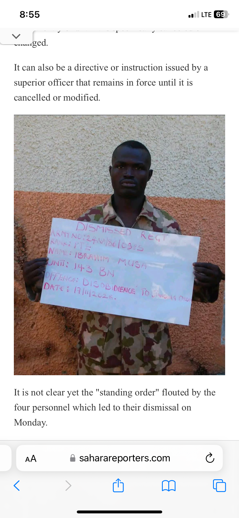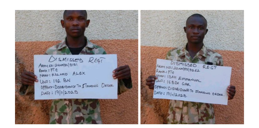 The Nigerian Army has dismissed four frontline soldiers fighting Boko Haram insurgents in the North-East region for allegedly disobeying a standing order. The soldiers, identified as Mukaila Mutari, Isah Emmanuel, Kolomo Alex, and Ibrahim Musa, were serving in the Operation Hadin Kai theatre of operations