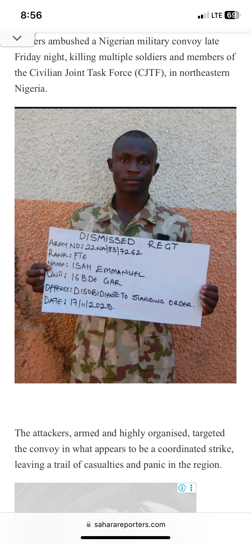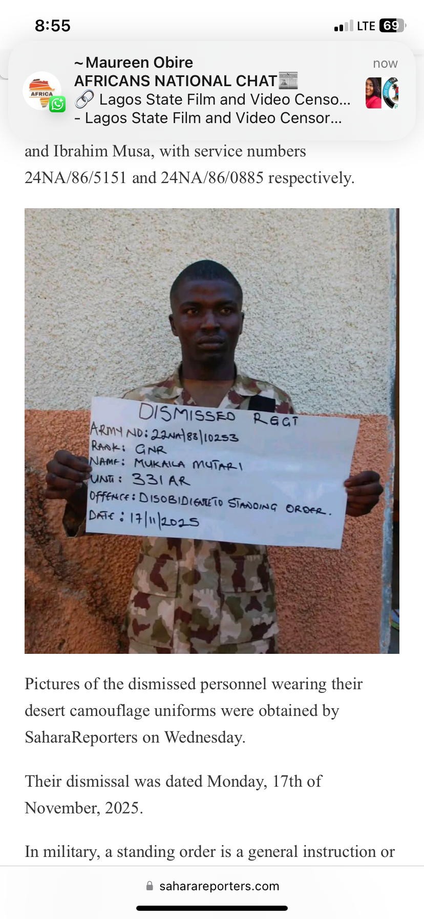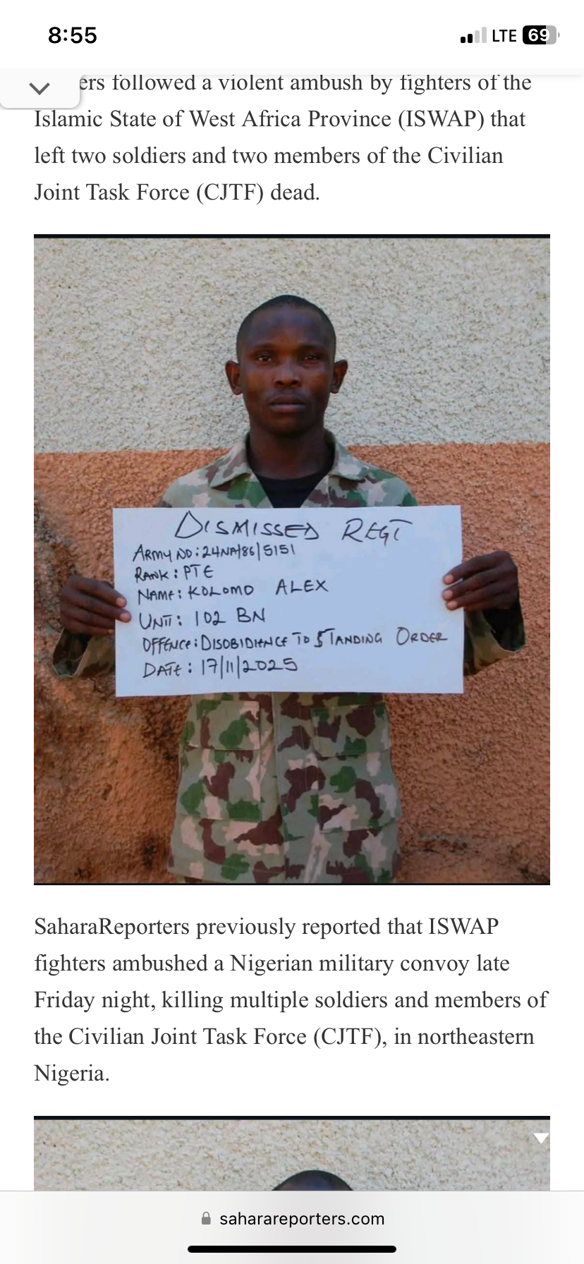 The dismissal was dated November 17, 2025, and coincided with the confirmation of the death of Brigadier-General Musa Uba, who was captured and killed by ISWAP terrorists. The military had been engaged in intense battles with Boko Haram and ISWAP fighters in the region, with multiple casualties reported .