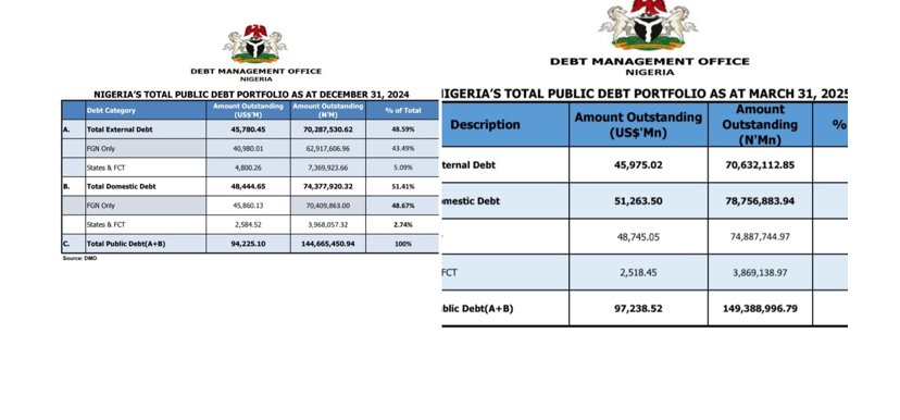 Nigeria’s public debt has reached a record high of N149.3 trillion as of March 31, 2025, according to data from the Debt Management Office. This represents a significant increase from N144.6 trillion in December 2024.