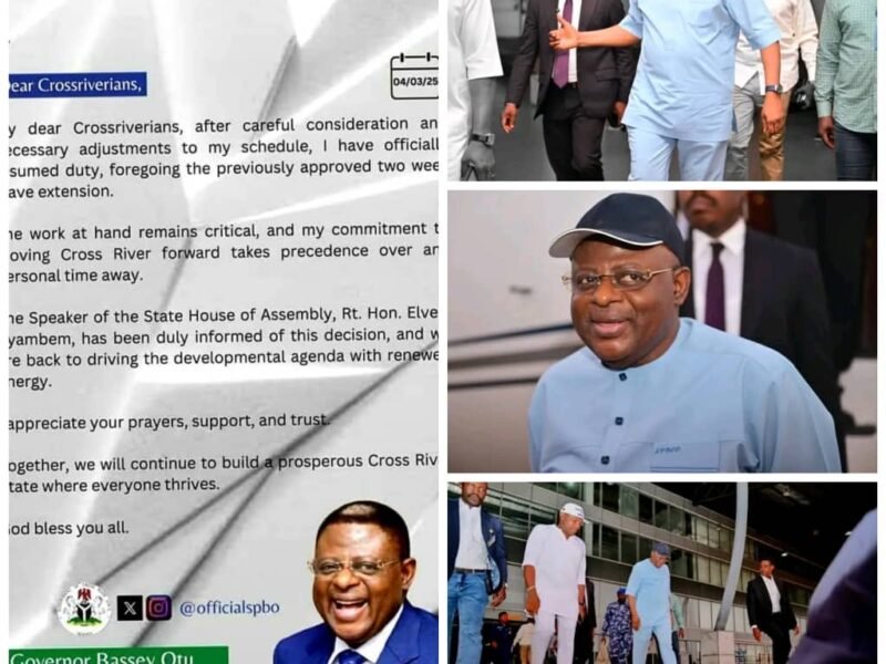 Read More 74 views1 minute read NEWS Governor Bassey Otu Returns to OfficeByLunagisthubApril 4, 2025No comments Governor Bassey Otu Returns to Office Governor Bassey Edet Otu of Cross River State has officially resumed his… Read More 0 0 0