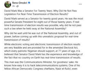 Former presidential aide Reno Omokri has criticized former Senate President David Mark for joining the call for real-time transmission of election results. Omokri argues that no country, including Brazil and Estonia, has real-time transmission of results, and that Mark’s proposal is unrealistic.