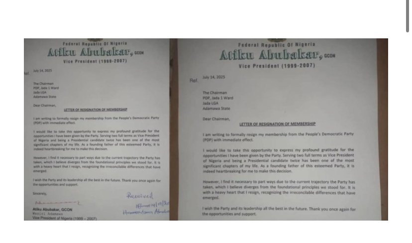 The news broke on July 16, 2025, when respected media personality Dele Momodu shared Atiku’s resignation letter, dated July 14, on social media. The letter was addressed to the chairman of his local ward, PDP Jada 1, located in Jada Local Government Area of Adamawa State.
