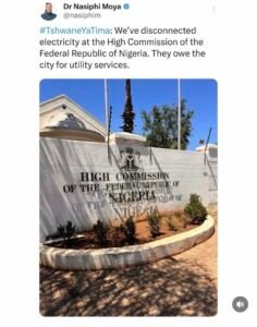 The City of Tshwane in South Africa has disconnected the power supply to the Nigerian High Commission due to unpaid utility bills. The decision was announced by the Executive Mayor of Tshwane, Dr. Nasiphi Moya, as part of the city’s ongoing TshwaneYaTima campaign to enforce payment from major debtors, including government entities and diplomatic missions.
