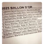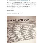 A supposed leak has been making rounds on social media, claiming to reveal the top 10 finishers for the 2025 Ballon d’Or. According to the alleged list, Raphinha would take the top spot with 800 points, followed by Ousmane Dembele in second with 710 points, and Lamine Yamal in third. However, another source suggests Lamine Yamal could be the winner, with Dembele in second and Vitinha in third .The leak has sparked debate among fans, with some questioning its authenticity due to glaring errors, such as misspelled names of prominent players. It’s worth noting that the actual winner will be announced on Monday night in Paris, and only time will tell if the leak is genuine .