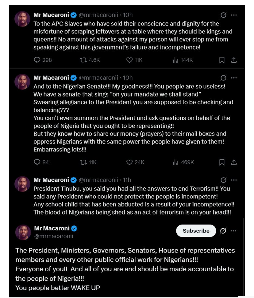 In a series of posts on X, Mr. Macaroni emphasized that public officials, including the President, Ministers, Governors, Senators, and members of the House of Representatives, work for Nigerians and must be held accountable for their actions. He urged them to “WAKE UP” and recognize their responsibility to the people