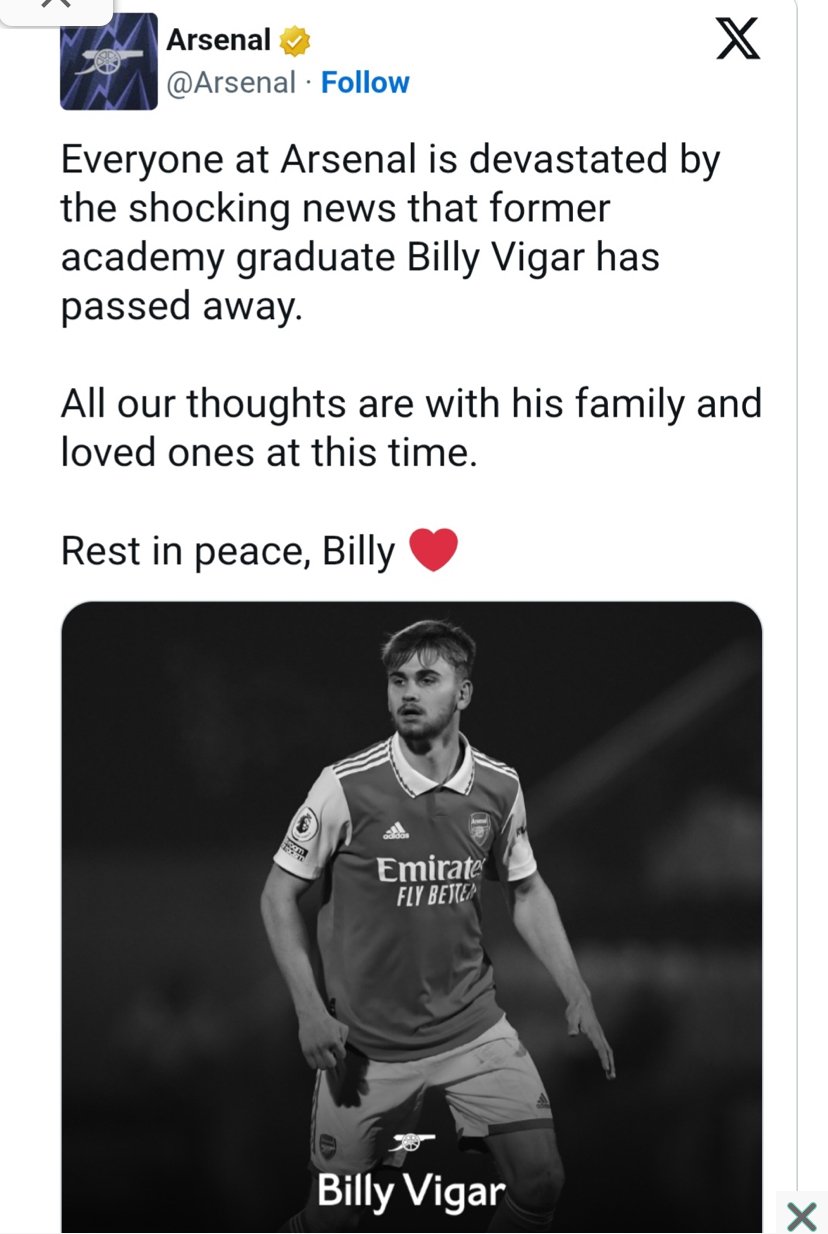 “Everyone at Arsenal Football Club is deeply sorry to hear of the tragic passing of Chichester City forward and former Arsenal academy player, Billy Vigar. Billy will always be remembered for his love of the game, pride at representing our football club, and a character beloved by teammates and coaches alike.”