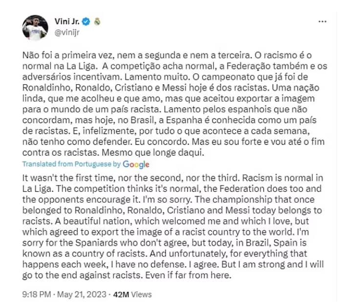 Expressing his emotions after the match, Vinicius Jr took to Twitter to share his experience and shed light on the persistence of racism in La Liga. The young Brazilian winger lamented, “It wasn’t the first time, nor the second, nor the third. Racism is normal in La Liga.” Vinicius Jr went on to express his disappointment, highlighting that the championship which was once graced by legendary players such as Ronaldinho, Ronaldo, Cristiano Ronaldo, and Messi, now seems see belong to racists. He expressed his love for Spain as a country but criticized the exportation of an image portraying it as a racist nation.